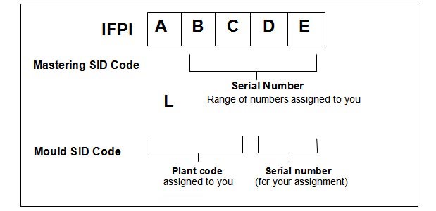 Example: A Mould SID Code of IFPI A01xx may be issued to you. The digits A01 are unique to you. You will then use the last two digits to allocate a unique code for each mould. The code for the first mould might be IFPI A0100, the code for the second IFPI A0101, and so on. Using alphanumeric digits consisting of the numbers 0 through 9 and the letters of the Western alphabet A through Z, excluding I, O, S and Q, the production licensee has the ability to assign unique codes to 1,024 different moulds.
